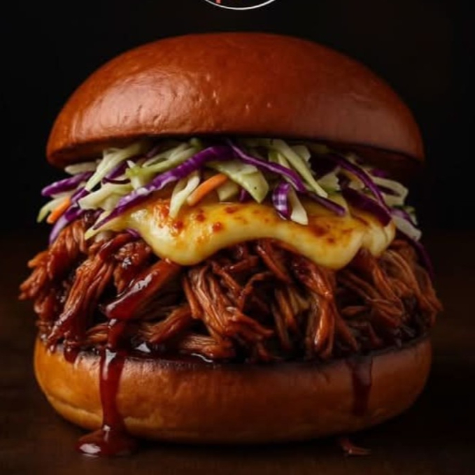 Pan artesanal, carne mechada de cerdo ahumada por 8 horas, queso mozzarella rebanado, tomate, ensalada de col y mayonesa de la casa acompañado de papas a la francesa o ensalada verde.