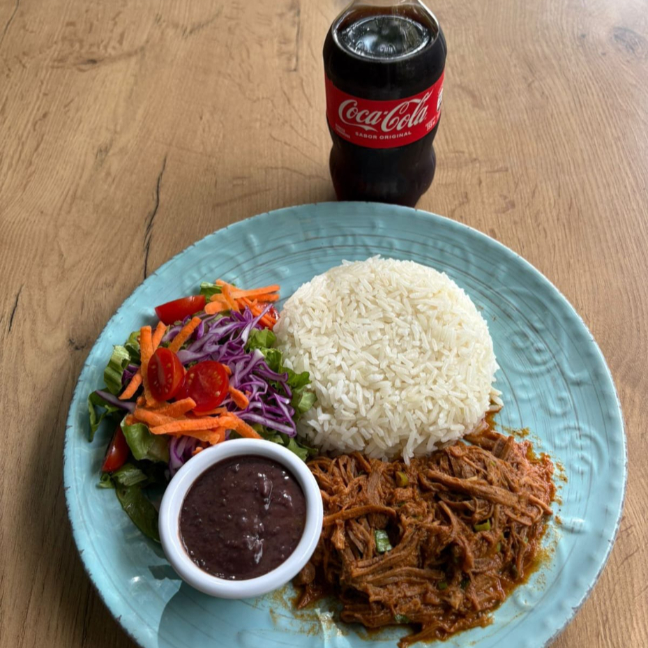 Acompañado de arroz, frijoles molidos, ensalada y proteína a elegir entre carne mechada y pollo mechado
