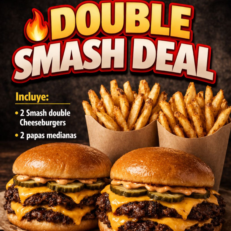 Dos smash burgers dobles con queso americano,pepinillos y nuestra salsa especialde la casa acompañado de papafritas crujientes.