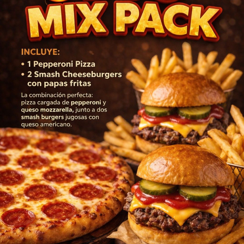 Pizza cargada de pepperoni y queso mozzarella, junto con dos smash burgers jugosas con queso americano y carne angus.