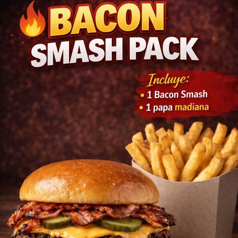 Smash burger con tocineta crujiente, queso americano, pepinillos y nuestra salsa especial... Acompañada de papas fritas doradas