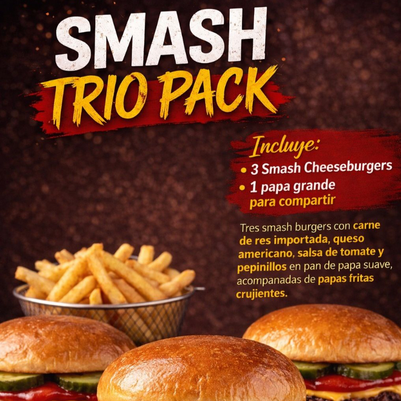 Tres smash burger con carne de res importada, queso americano, salsa de tomate y pepinillos en pan de papa suave... Acompañadas de papas fritas crujientes.