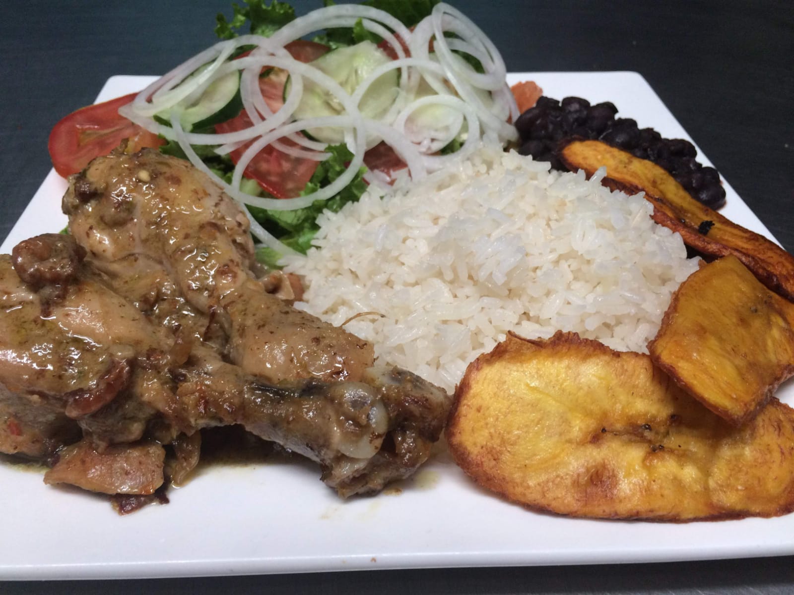 Arroz frito, fajitas de res, papas y ensalada.