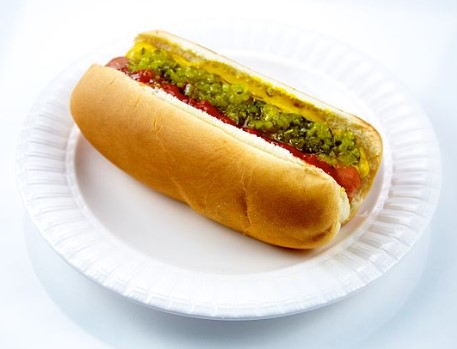 Pan, salchicha, cebolla. papa tostada, salsas, pollo desmenuzado y mozzarella.