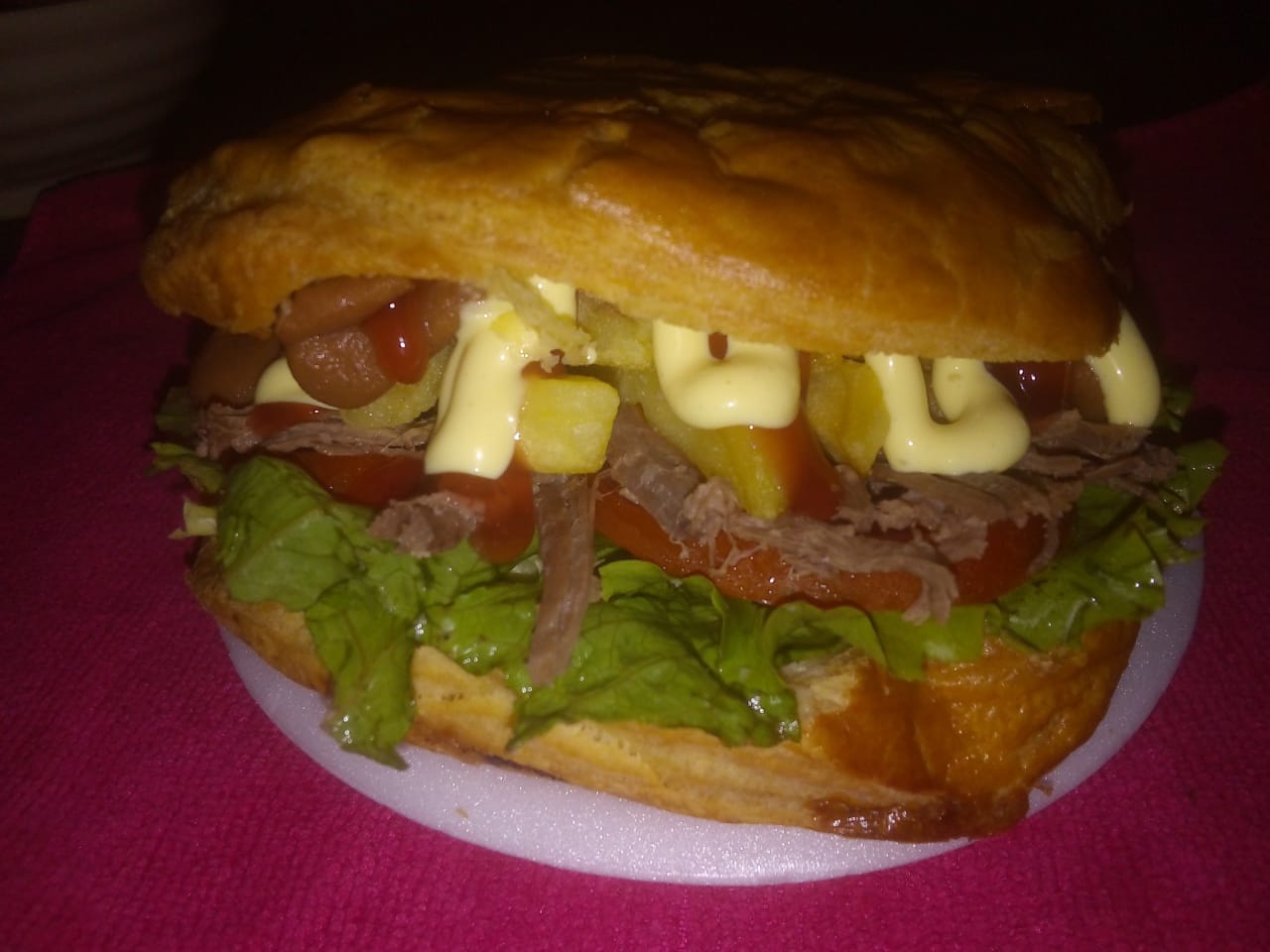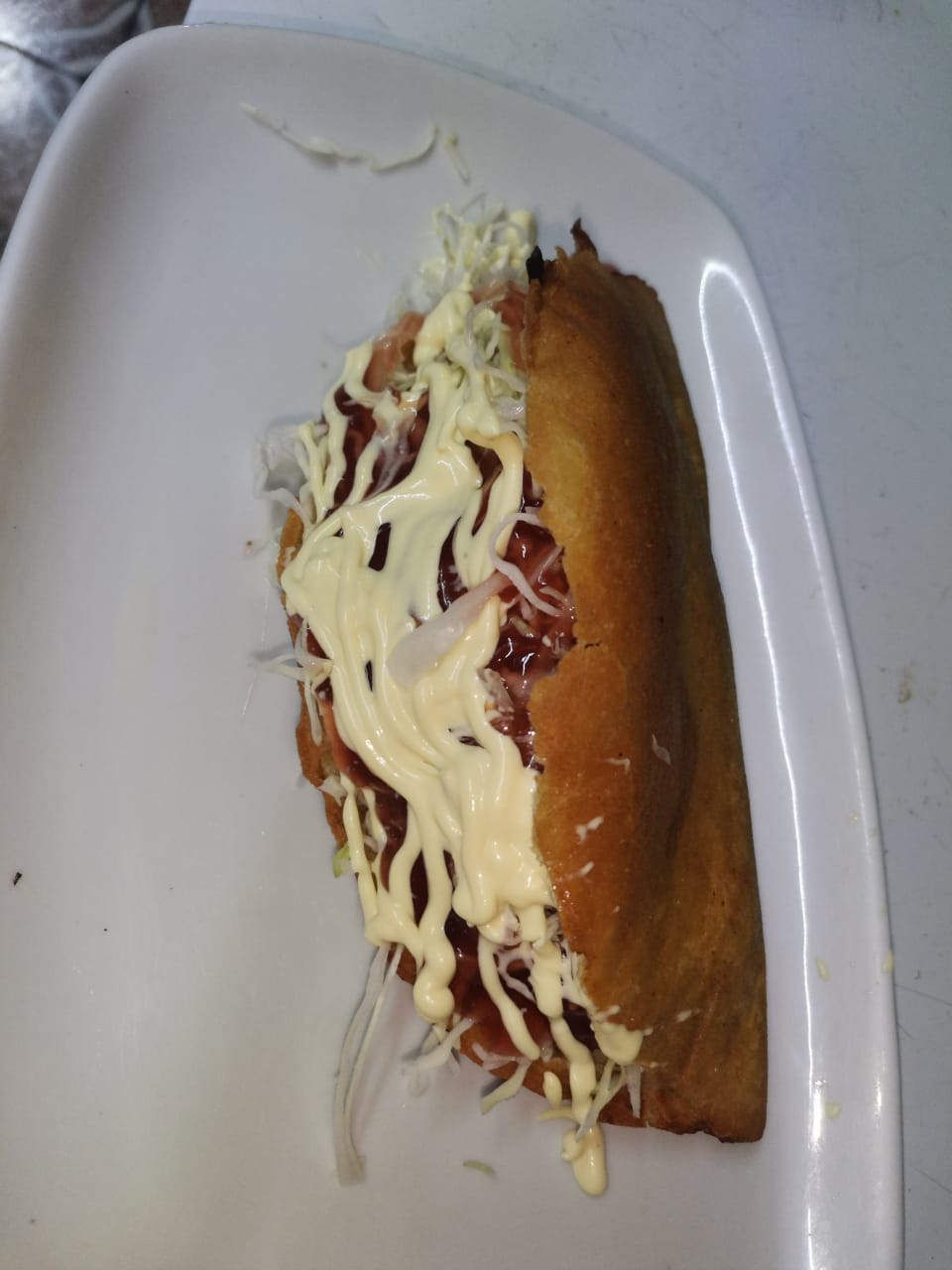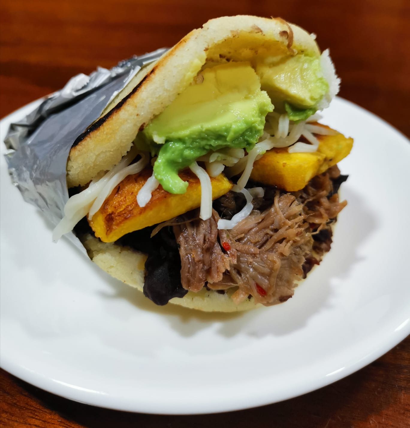 Arepa de maíz cascado, carne desmechada, hongos, maíz dulce, lechuga, tocineta y salsas.