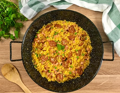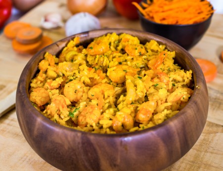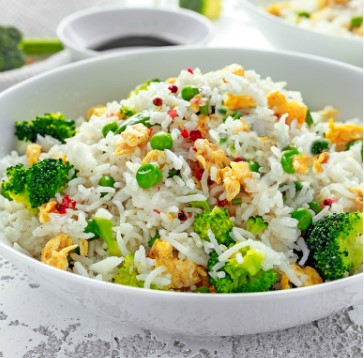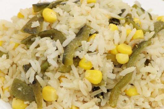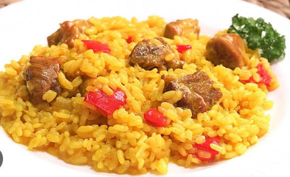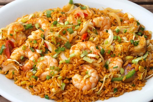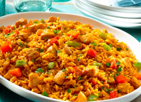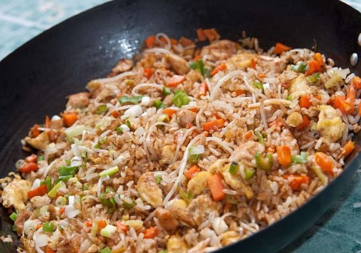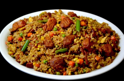 Arroz frito, pollo salsa agridulce, fajitas y papas.