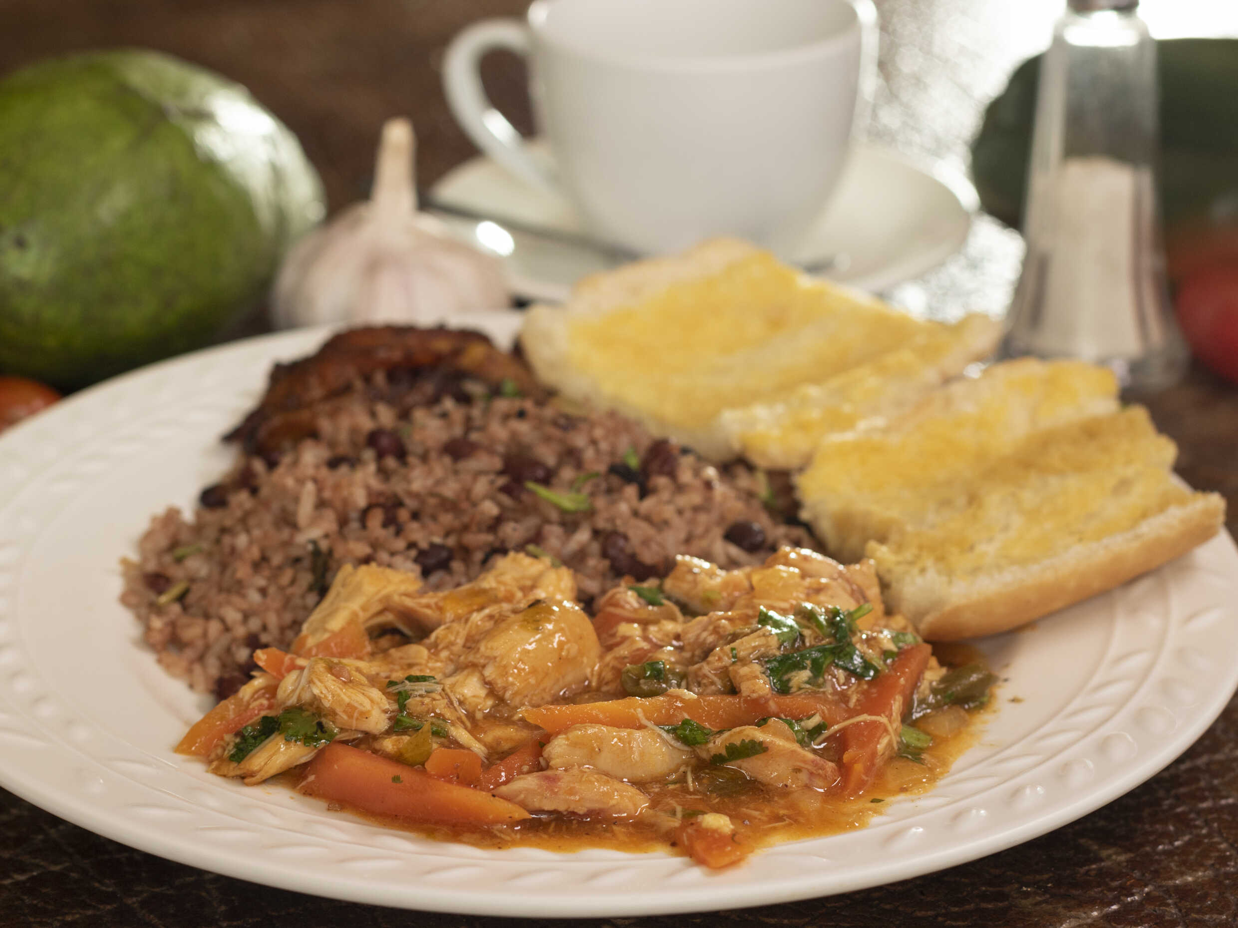 Pinto, Café y Maduros y carne en salsa más pan