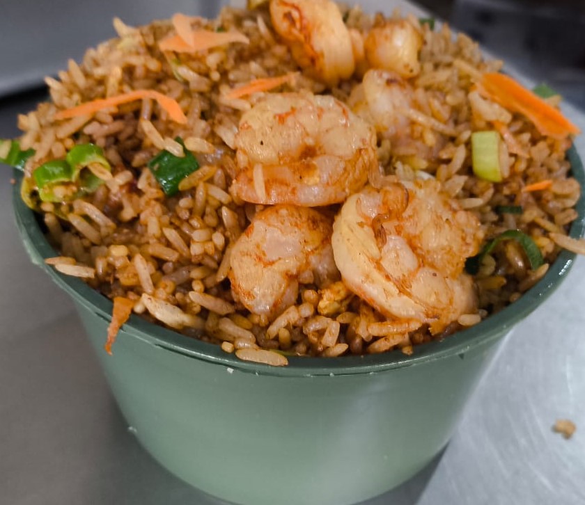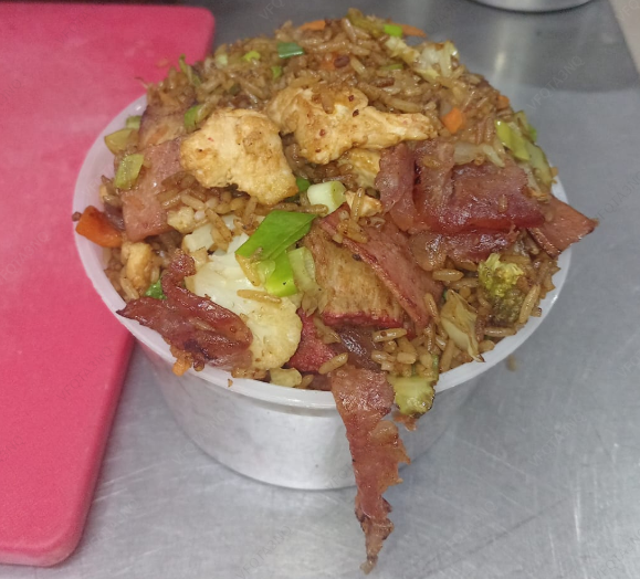 Delicioso arroz cantonés, acompañado de 4 alitas 25 g de papas fritas y ensalada verde, bebida Pepsi de 355 ml.