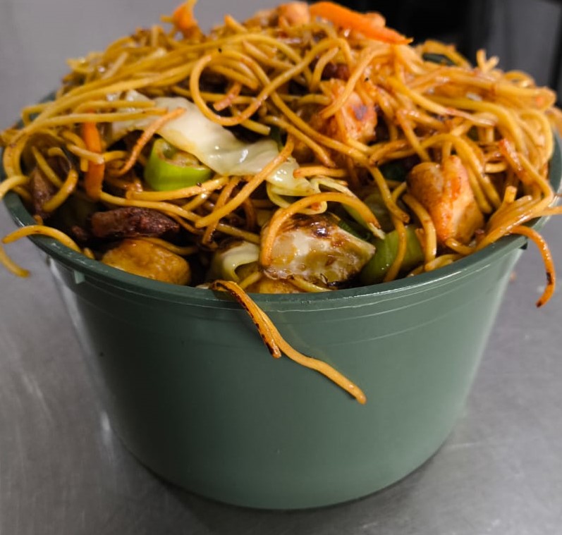 Entero de chop suey en salsa con pollo, jamón y acompañado de verduras.