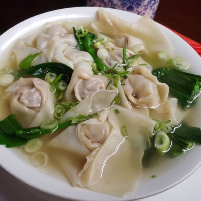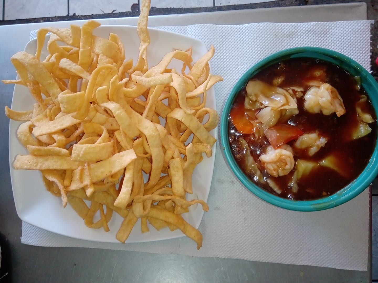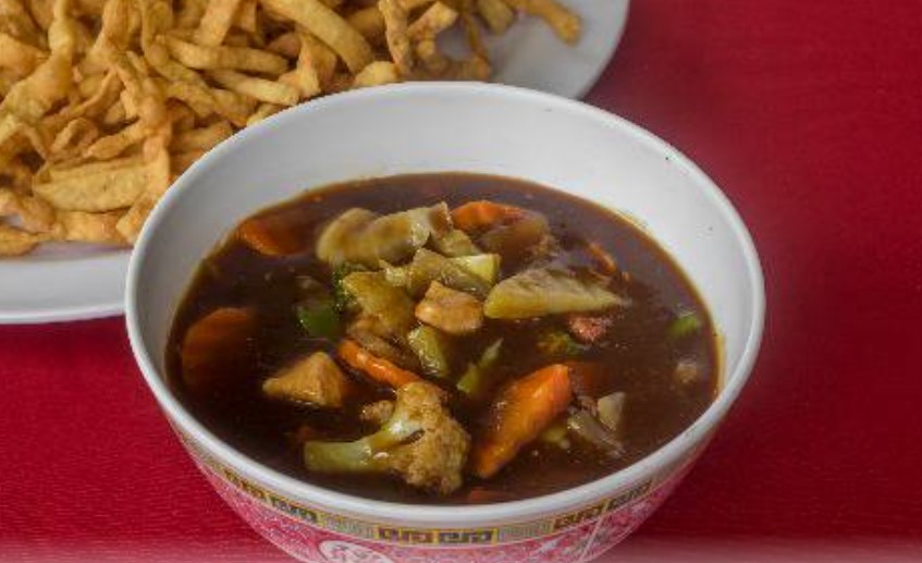 Chowming de la casa Son verduras en salsa de ostión con broccolí, zanahoria, coliflor, chayote y chile)con carne lechón jamón chorizo chino pollo y pasta frita de wantan