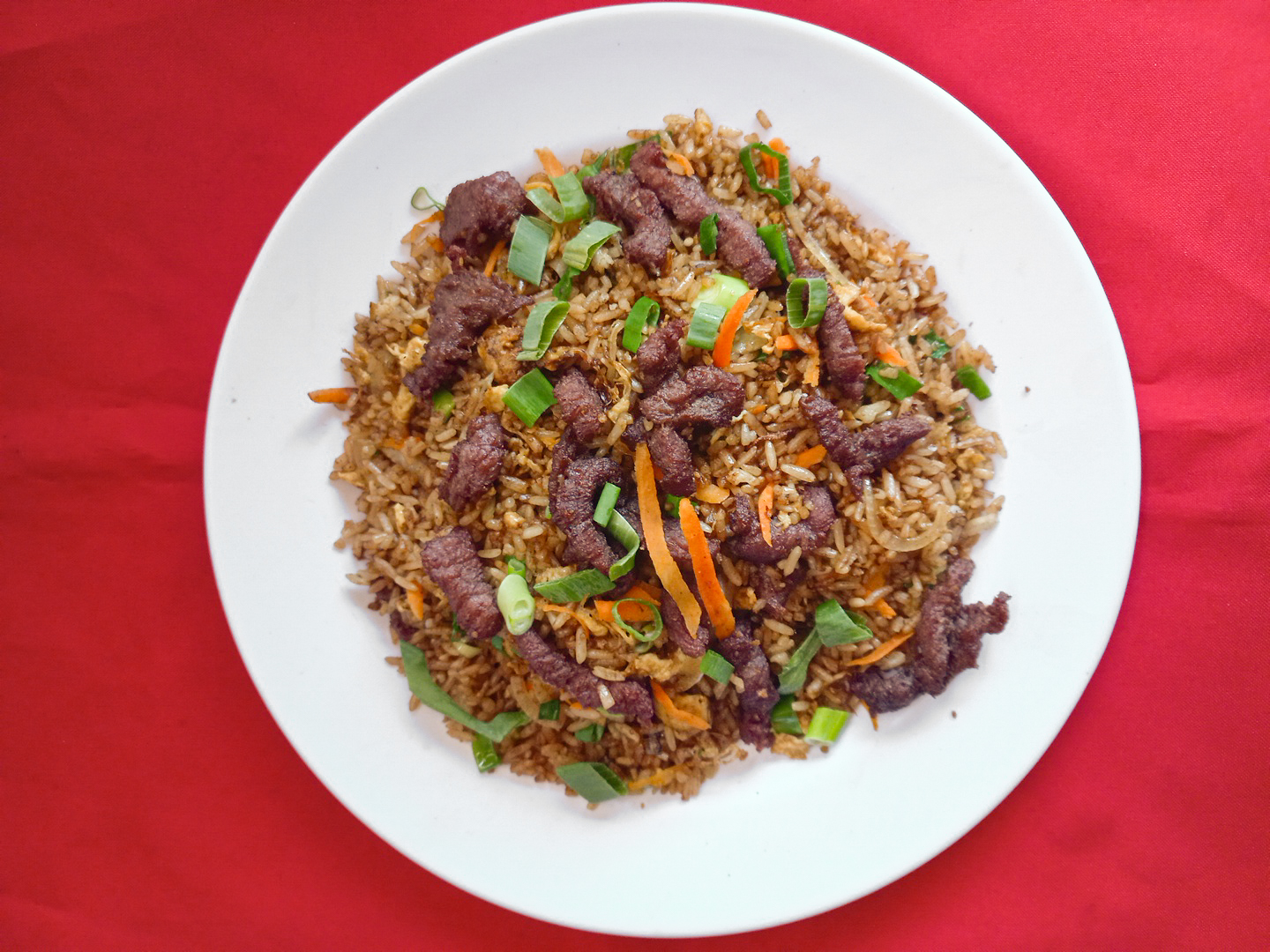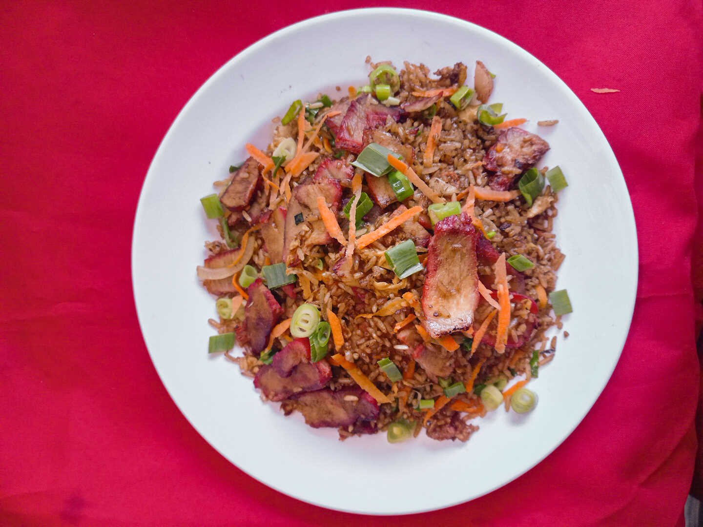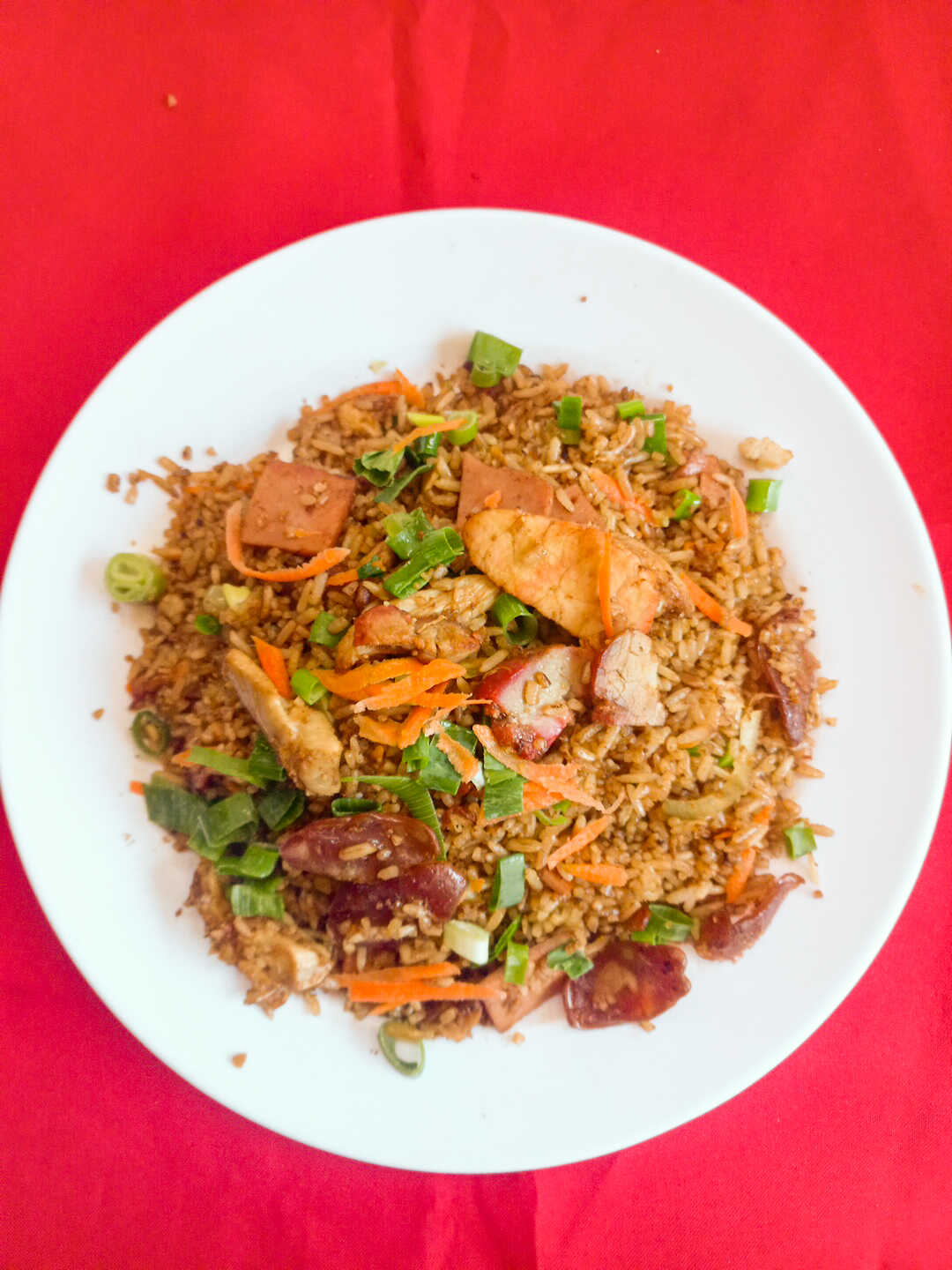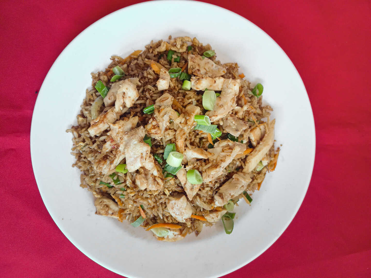 Arroz con cebolla, zanahoria, especias, pollo, jamón, lechón y chorizo chino cantón, frito o en salsa (120 g de proteína). Elige el tamaño.