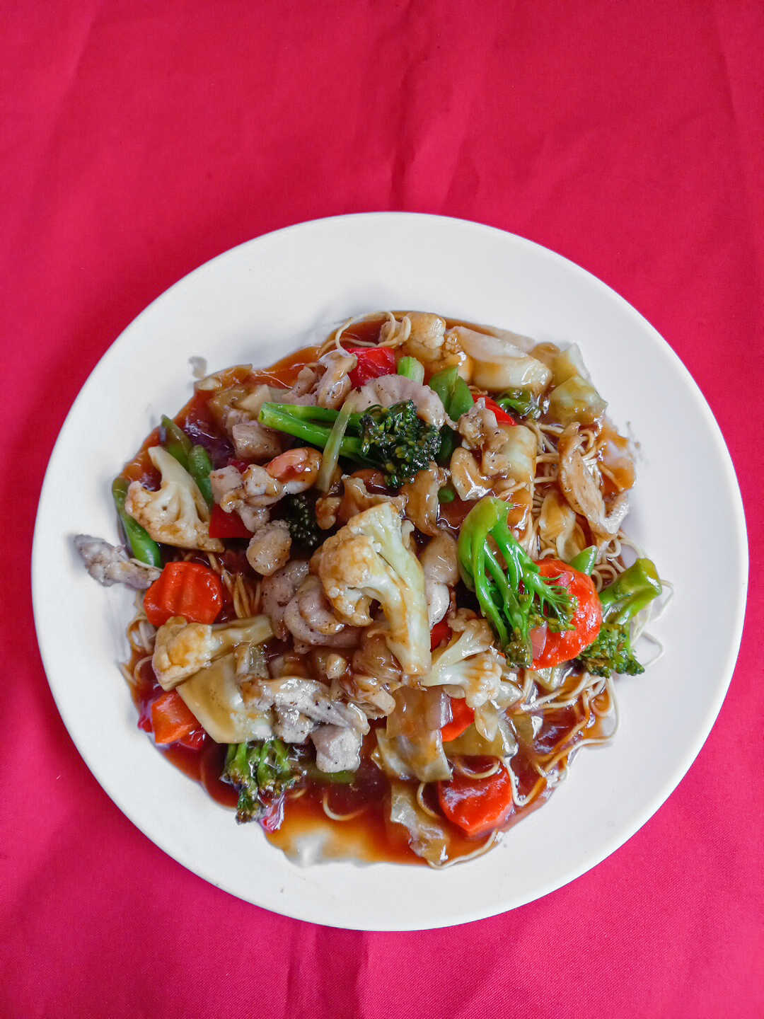 Carne de res con coliflor brocoli cebolla chile dulce ajo estilo chino