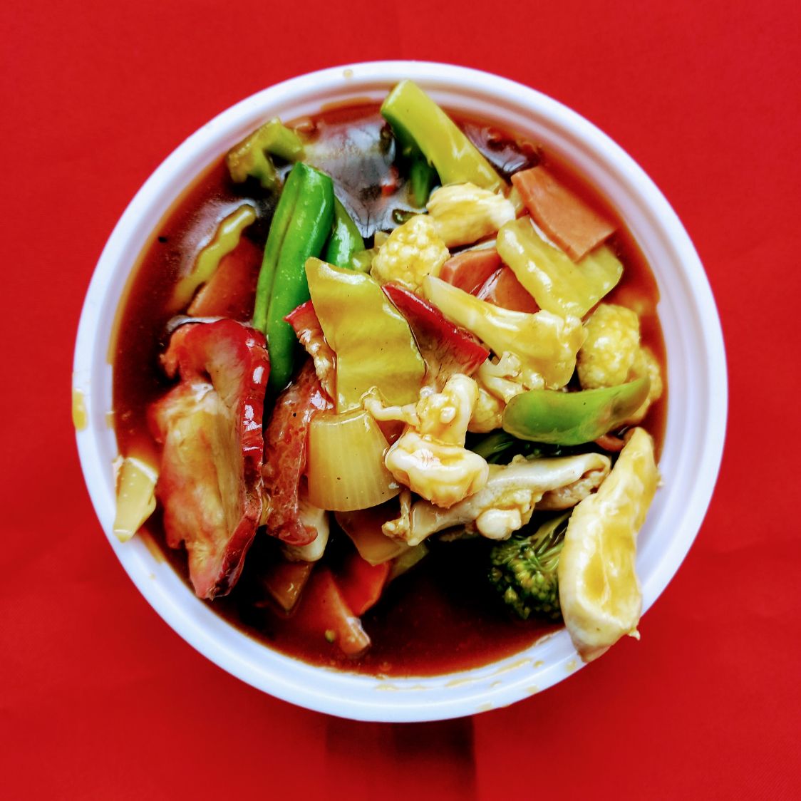 Chop suey con chorizo chino con cebolla zanahoria chile dulce coliflor brocoli vainica en salsa de ostión