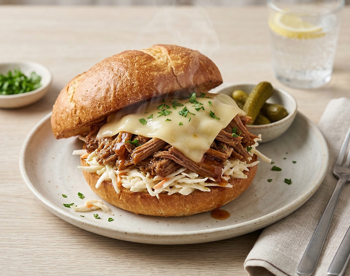 Pan, pulled pork, queso,tomate,ensalada de repollo dulce
