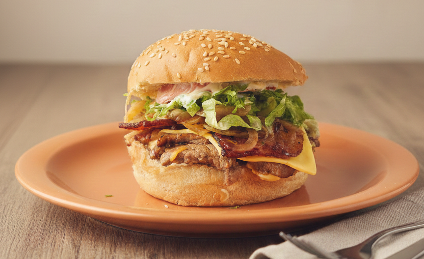 Hamburguesa personal: Torta de carne de res, jamón crunch, queso, cebolla caramelizada y salsa de queso.
