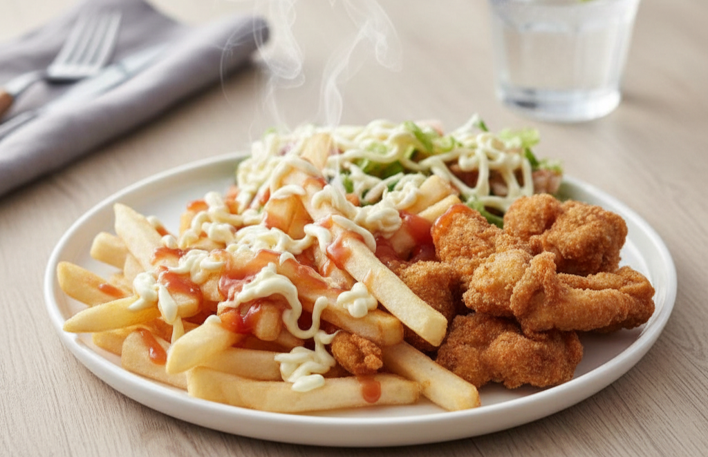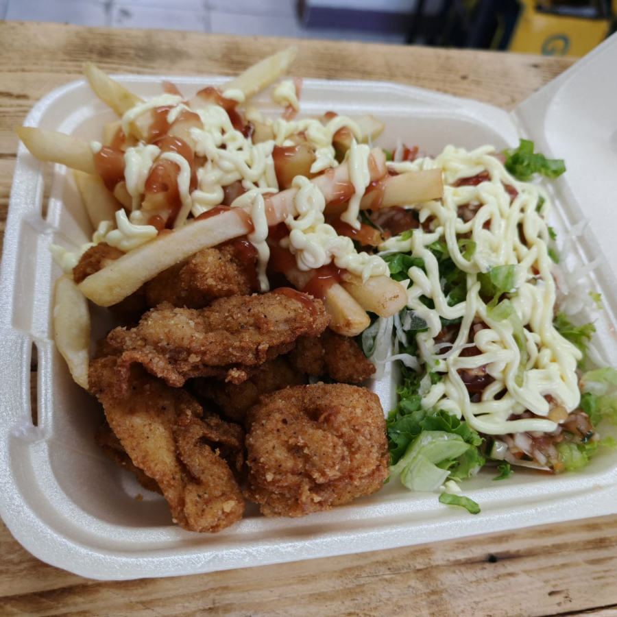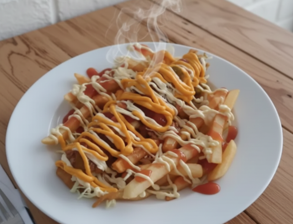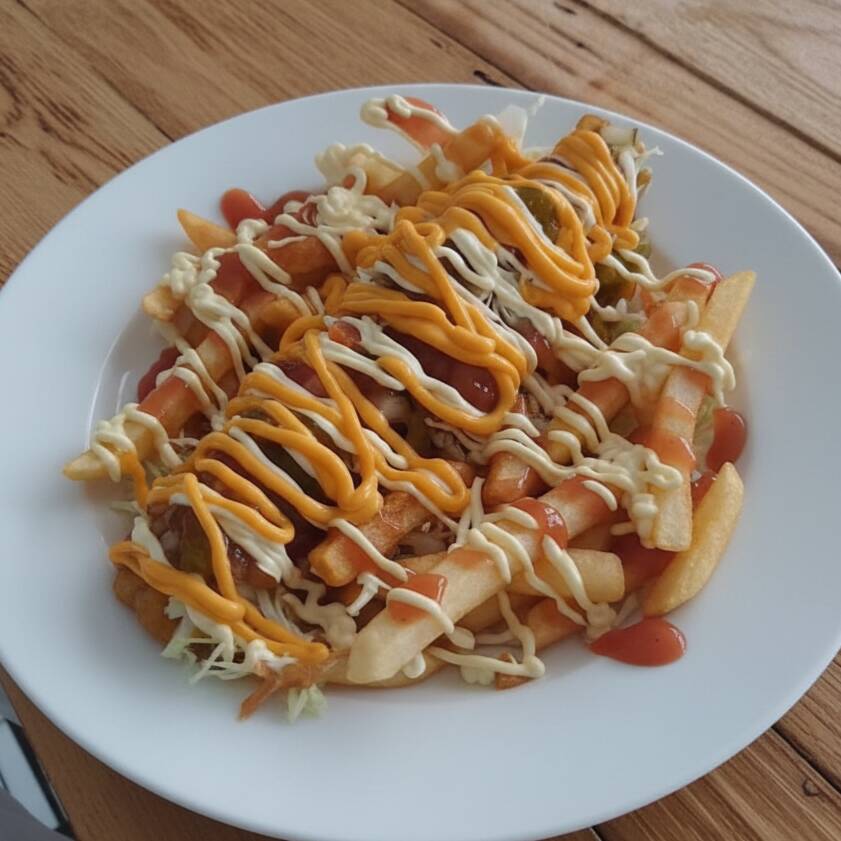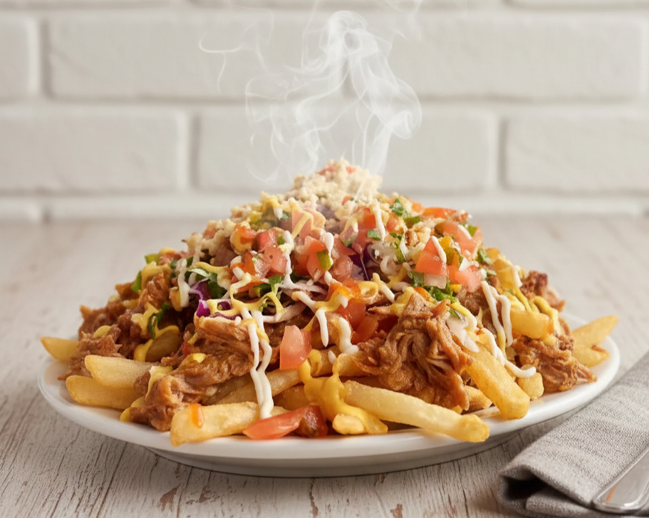 300 g De papas fritas, frijoles molidas, (carne o pollo) pico de gallo, salsa de tomate, mayonesa y salsa de queso.