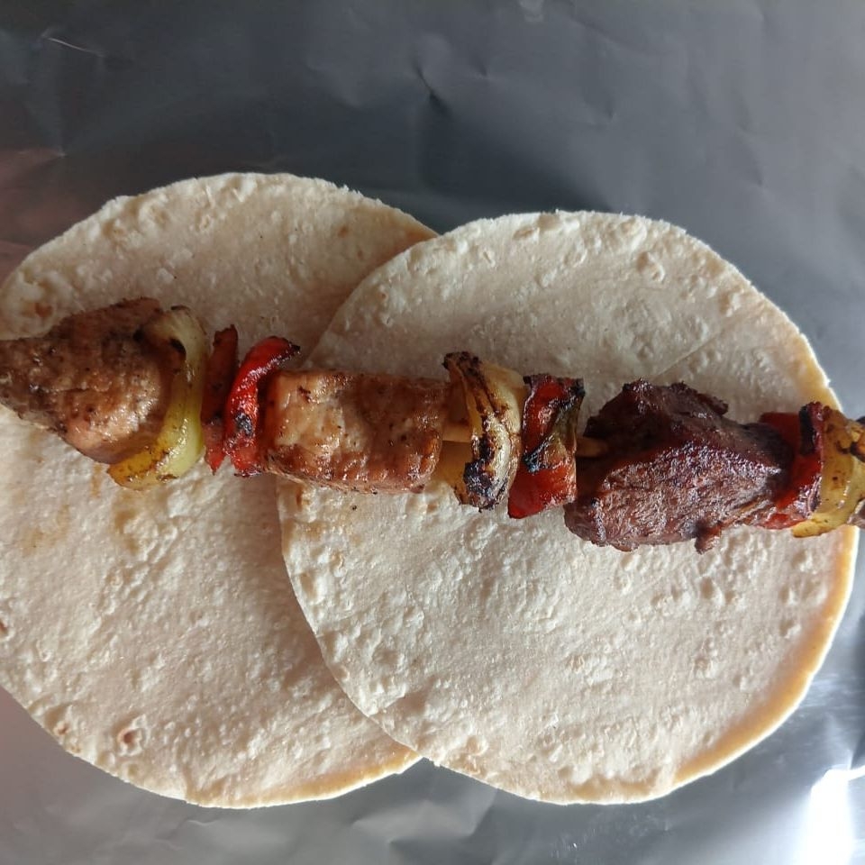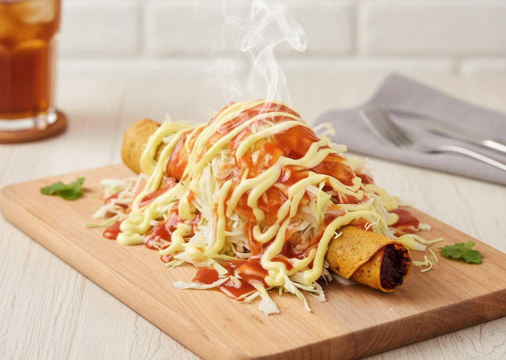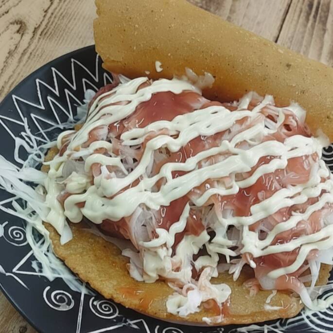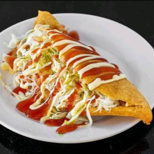 Tortillitas con carne o pollo, frijoles molidos, lechuga, pico de gallo, salsa de tomate, mayonesa, natilla y salsa de queso.