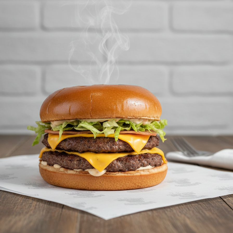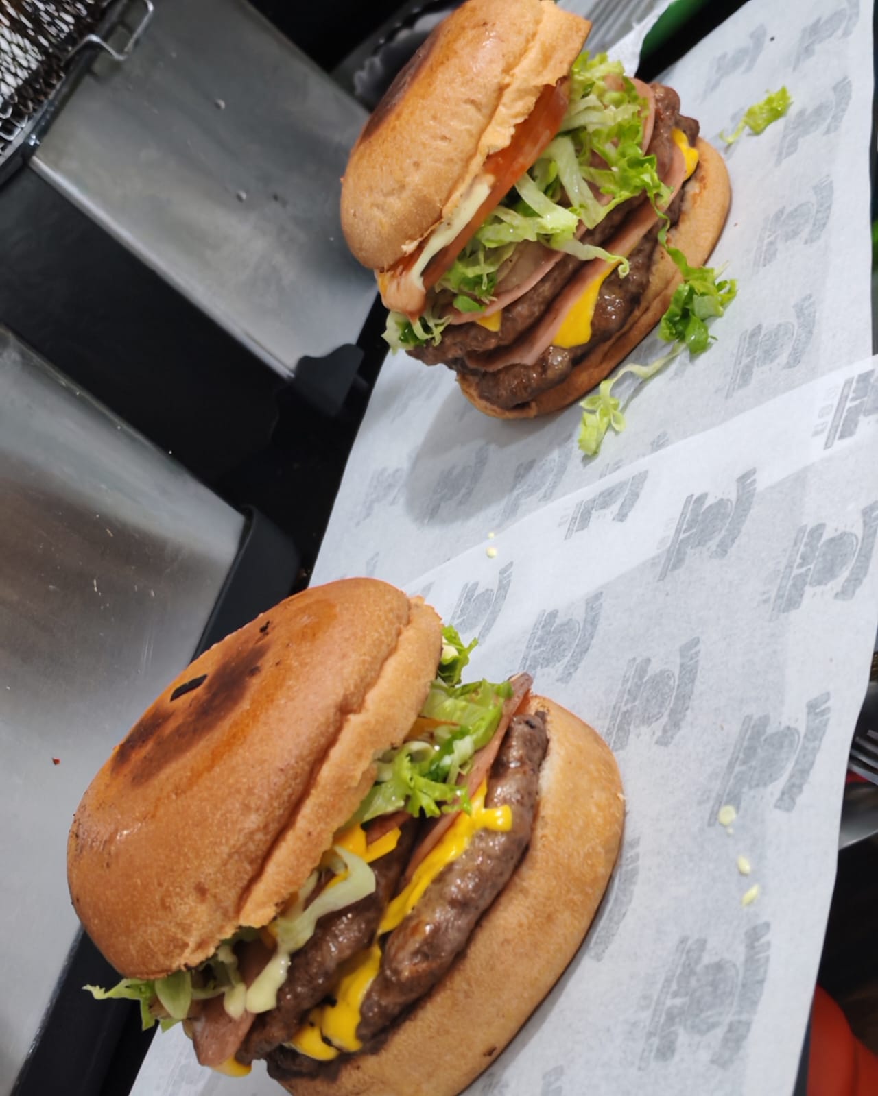 Dos Tortas de carne de res, jamón, queso amarillo, cebolla, lechuga, tomate, pepinillos, salsa de tomate, mayonesa y salsa de queso.