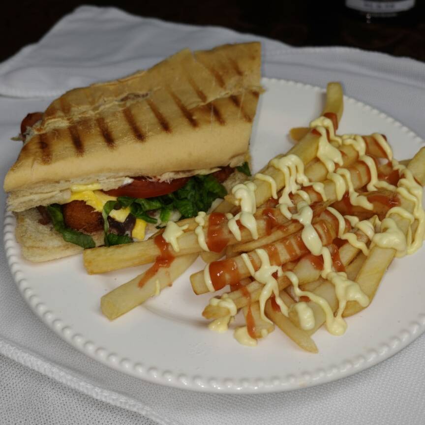 Filete de pescado empanizado con dos acompañamientos favoritos.