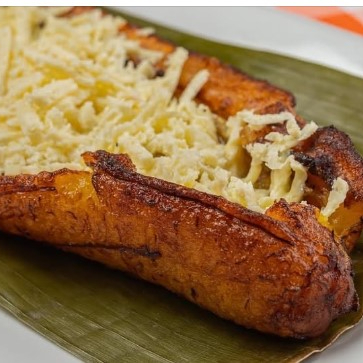 Plátano maduro entero, relleno de queso y natilla.