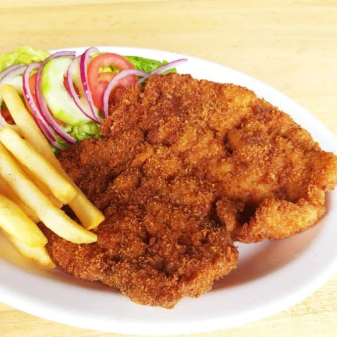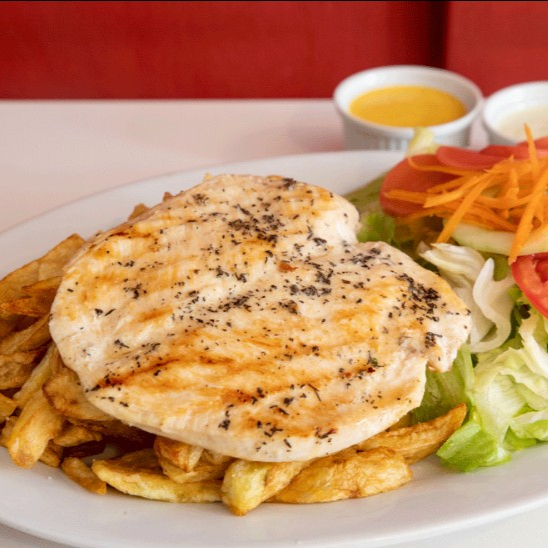 Filete de pollo a la plancha con dos acompañamientos favoritos.