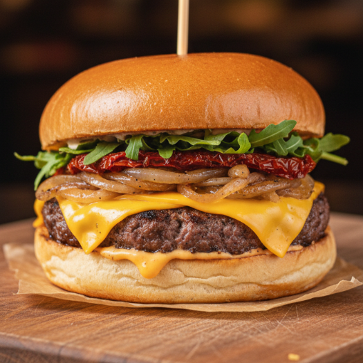 Torta de carne de res, jamón crunch, queso, cebolla caramelizada y salsa de queso.