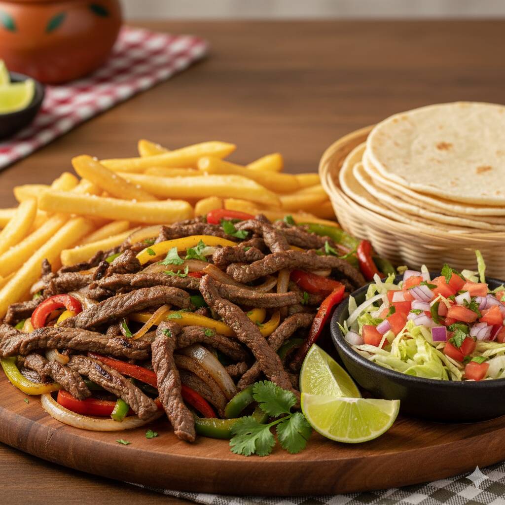 Fajitas mixtas de cerdo y res con dos acompañamientos favoritos.