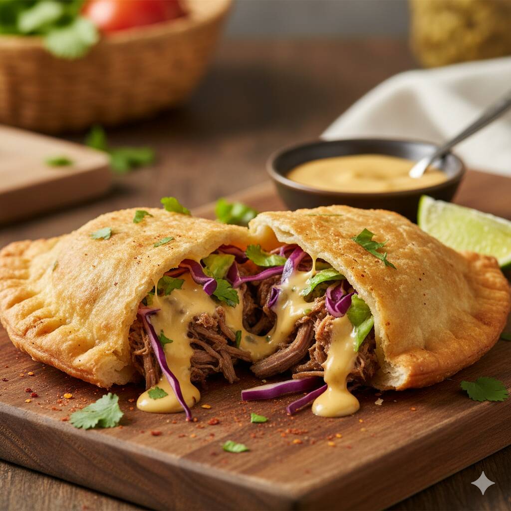 Empanada tradicional con tu relleno favorito, repollo, salsa de tomate y mayonesa.