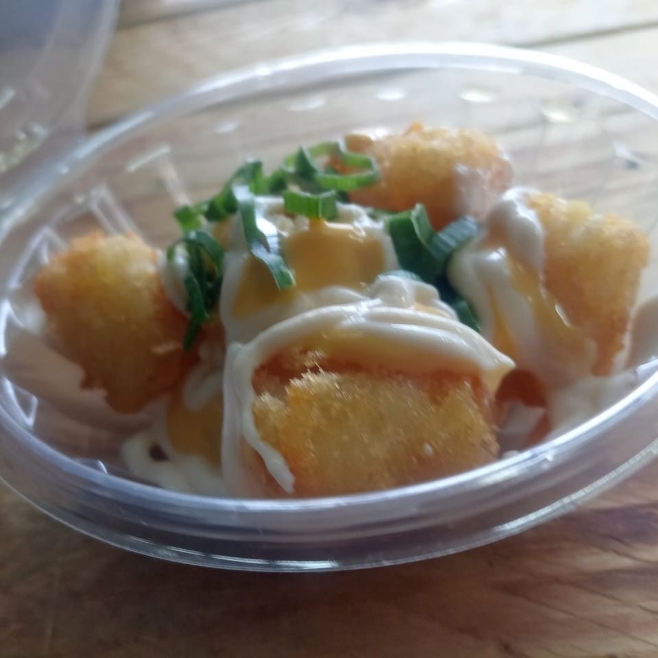 Bolitas de papa, salsa de queso, natilla y cebollino