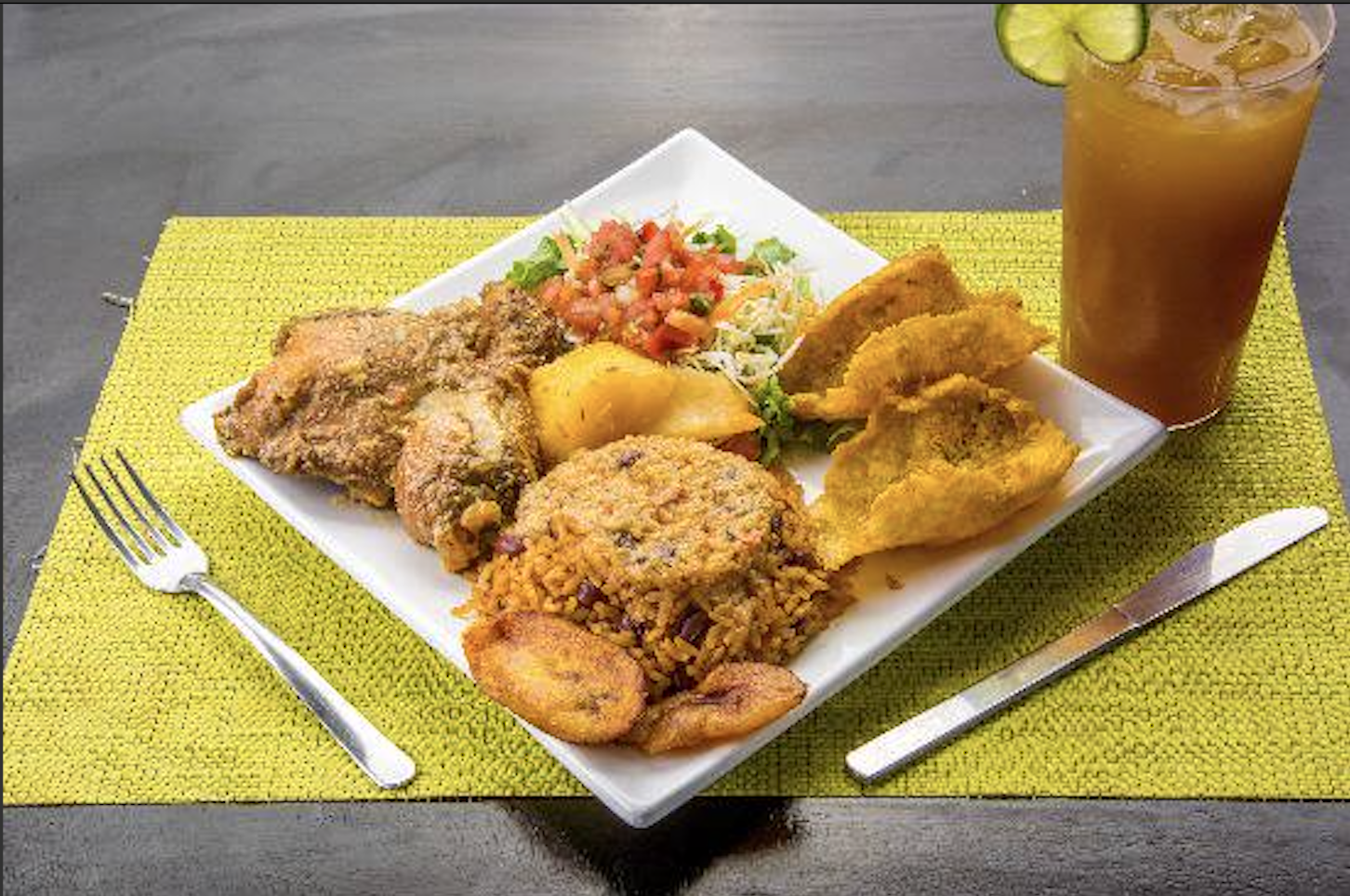 Rice and beans bañado en salsa caribeña, patacones, plátano maduro, ensalada, escabeche y limón.