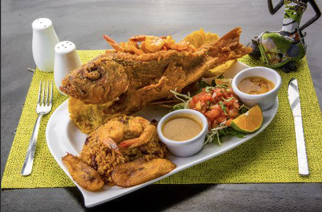 Al estilo caribeño, acompañado de papas fritas, patacones o ensalada verde.