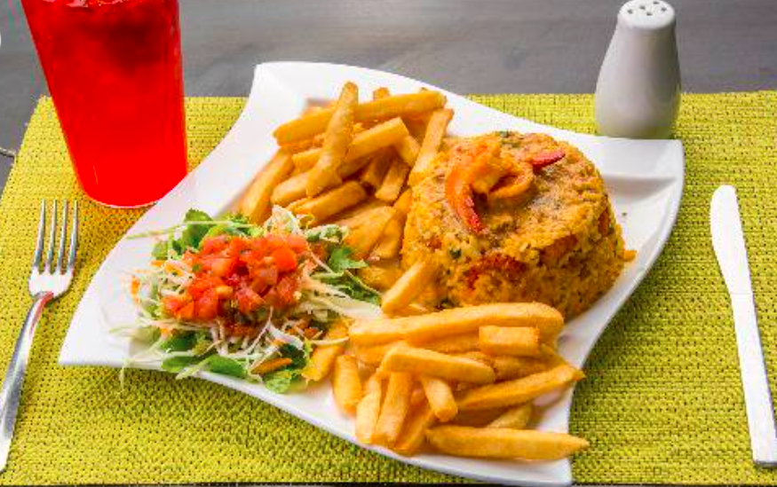 Rice and beans bañado en salsa caribeña con mariscos, plátanos maduros, ensalada y patacón.