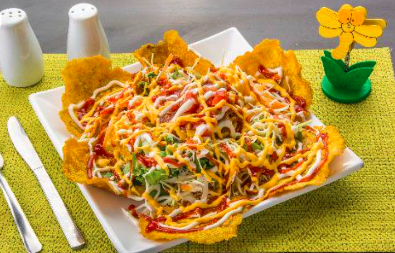 De carne, res o pollo con frijoles molidos, salsa de queso, pico de gallo, ensalada y salsas.
