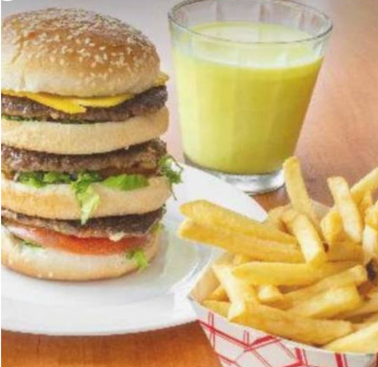 Es una hamburguesa elaborada con 3 tortas, 4 panes, lechuga, tomate natural, queso amarillo y salsita de la casa, más papitas fritas y refresco natural