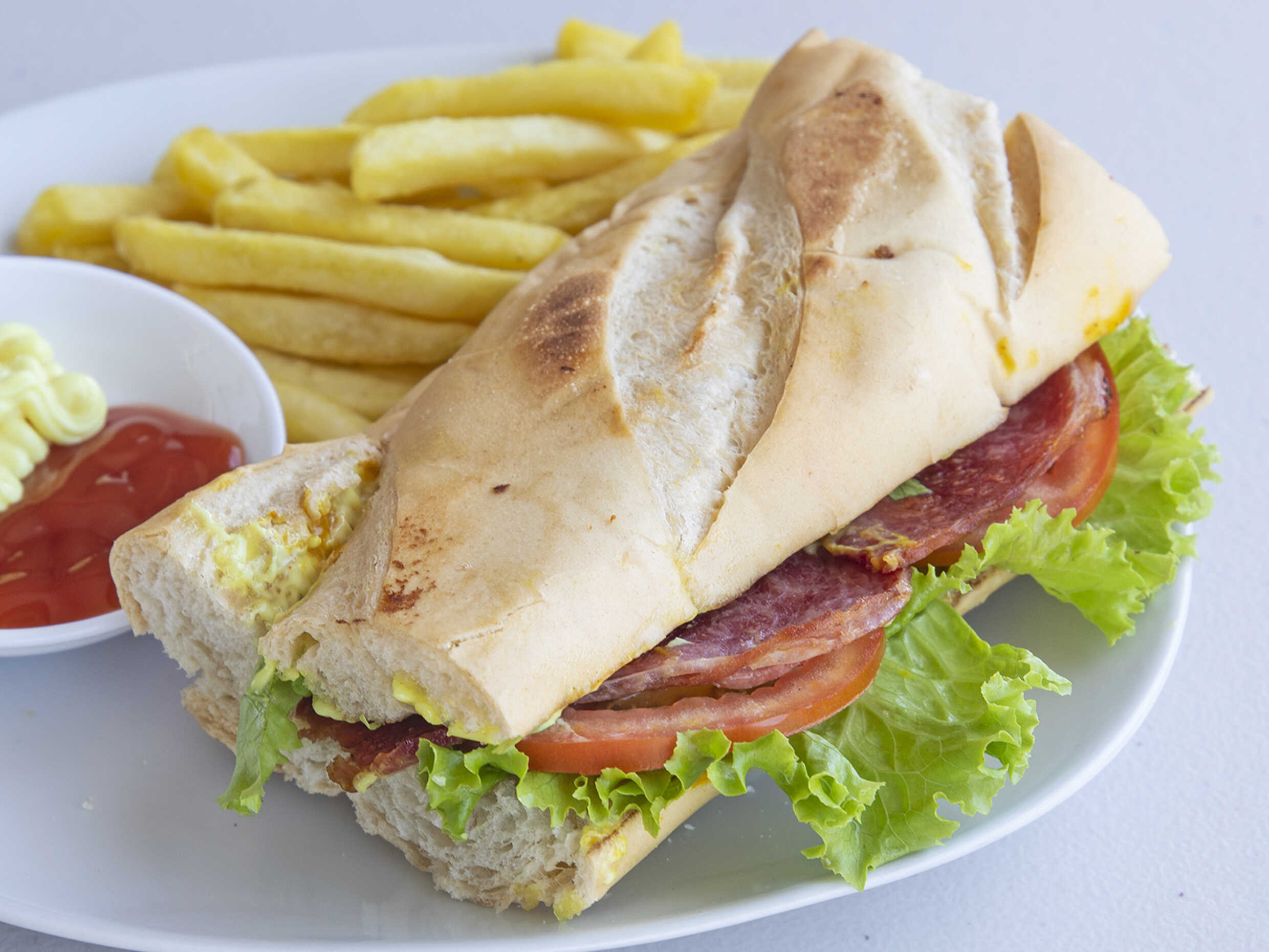 A base de pan baguete, lechuga, tomate y salsa de la casa.