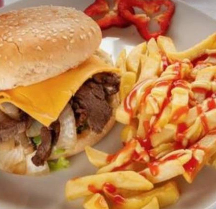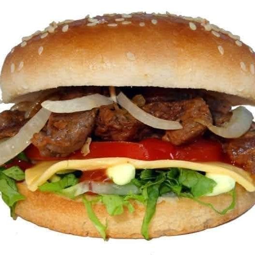 Es una hamburguesa de lomo en fajitas salteadas a la plancha con queso, lechuga o repollo, tomate y salsa de la casa.