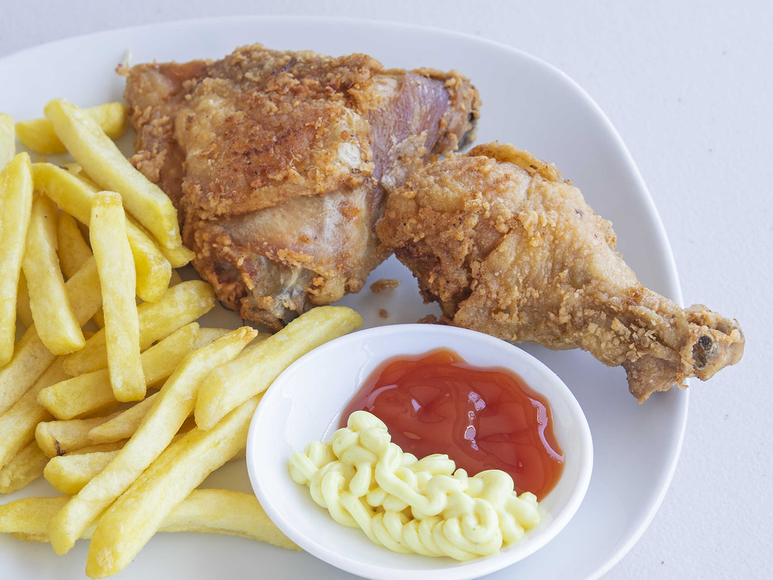 Cuarto y muslo de pollo frito acompañado de papas o doraditas y refresco natural