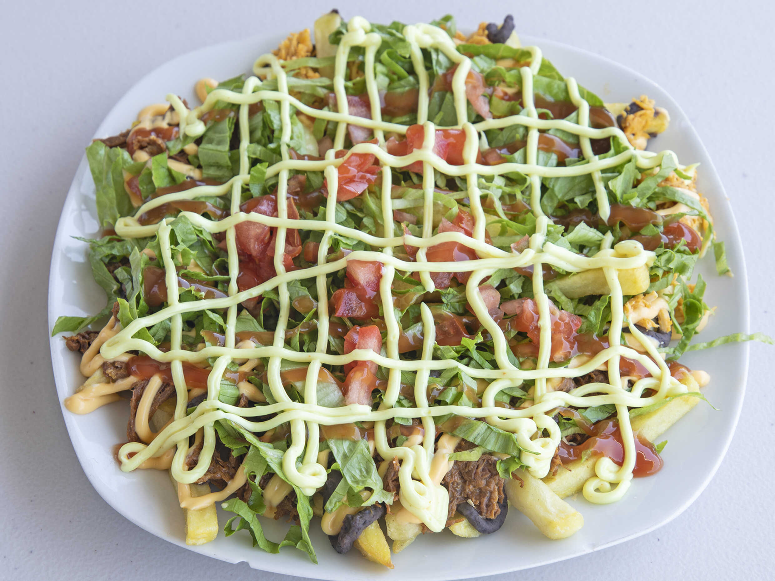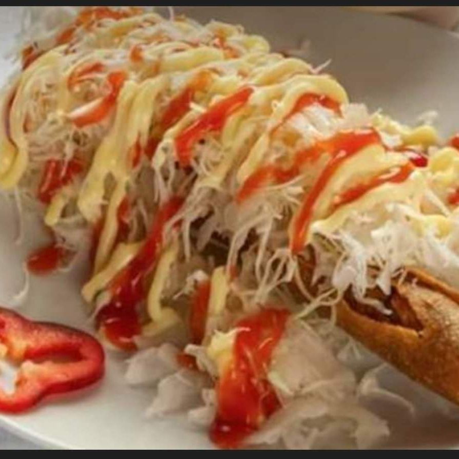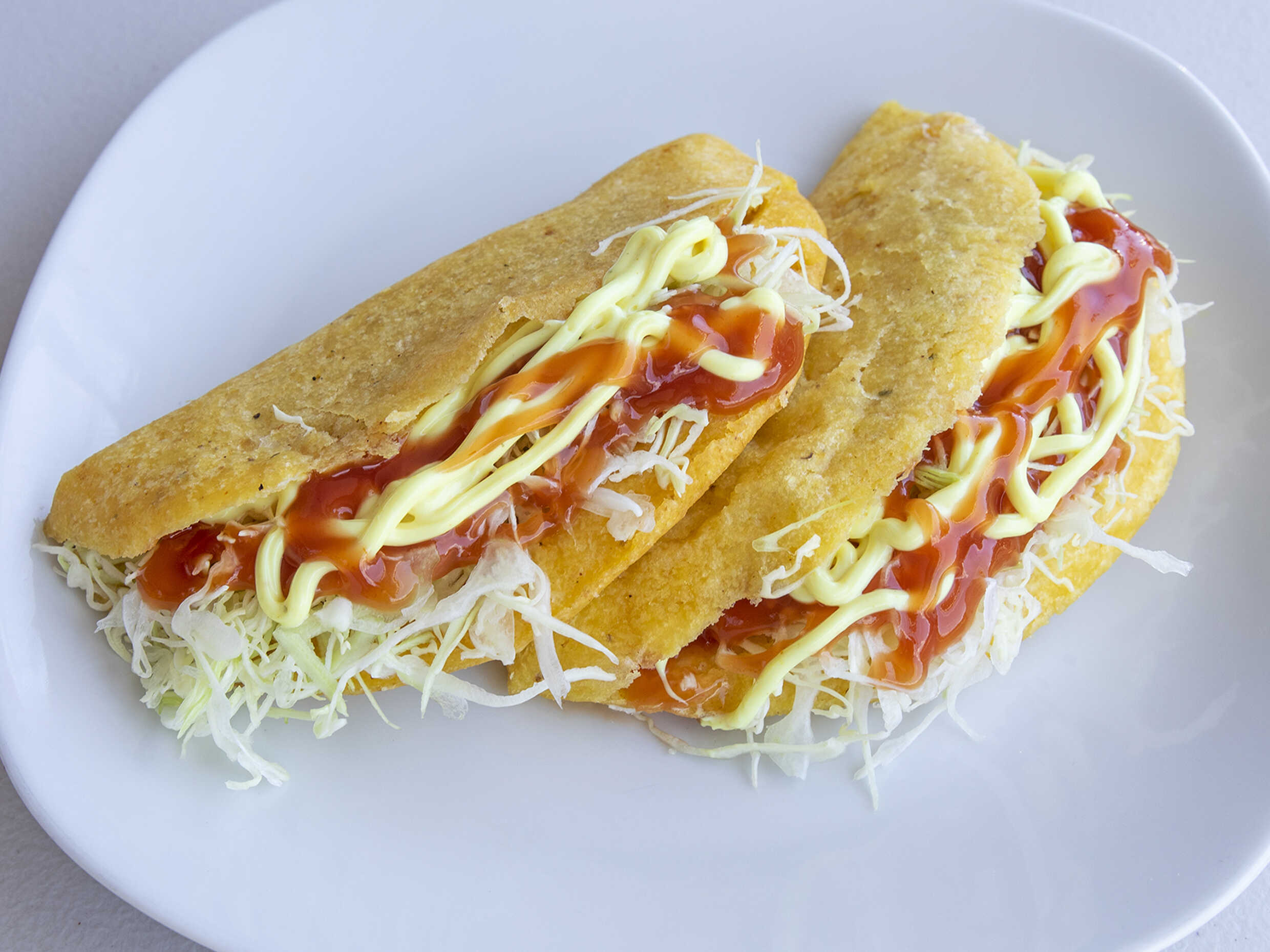 A base de tortilla de maíz, carne mechada, acompañado con repollo o lechuga con salsa de tomate y mayonesa casera.