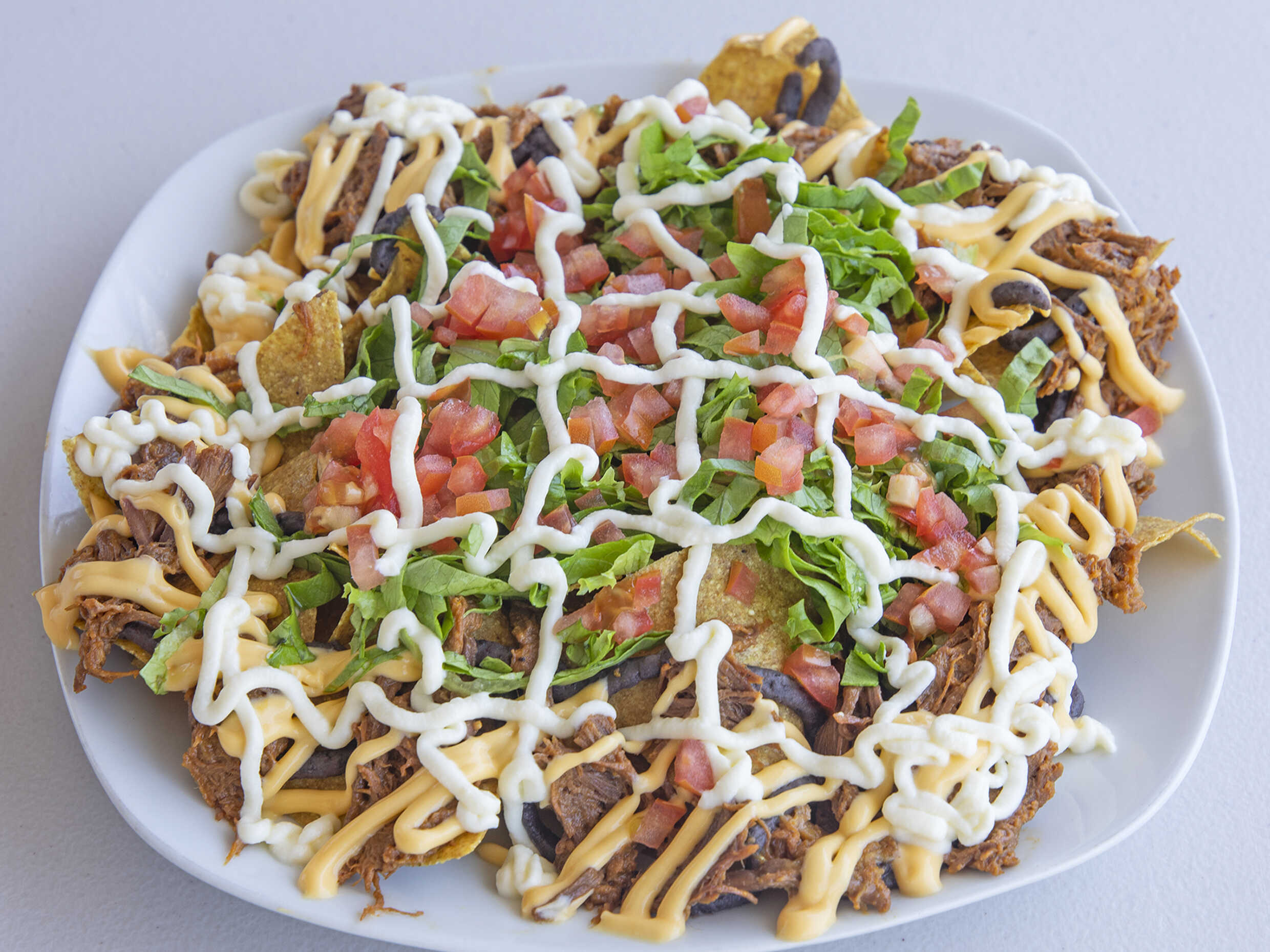 Deliciosos nachos grandes con tortillas de maíz, tostadas acompañadas con frijoles molidos, queso cheddar, lechuga, tomate con natilla o salsas de pollo, carne o mixtos.