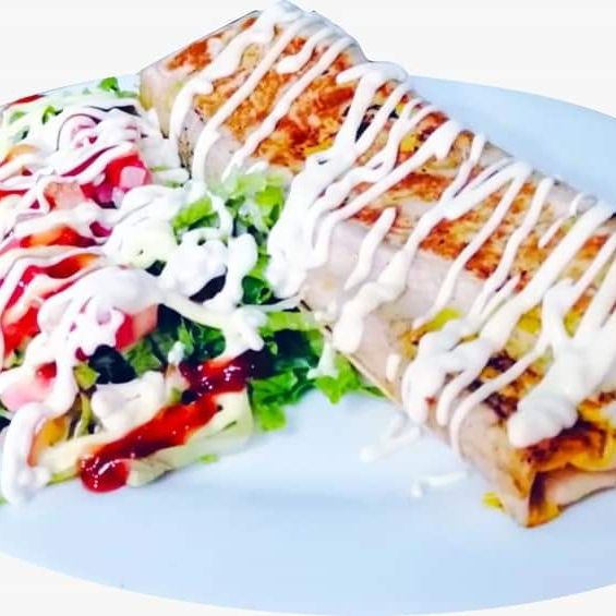 A base de tortilla de harina, frijoles molidos, queso cheddar, papa y ensalada.