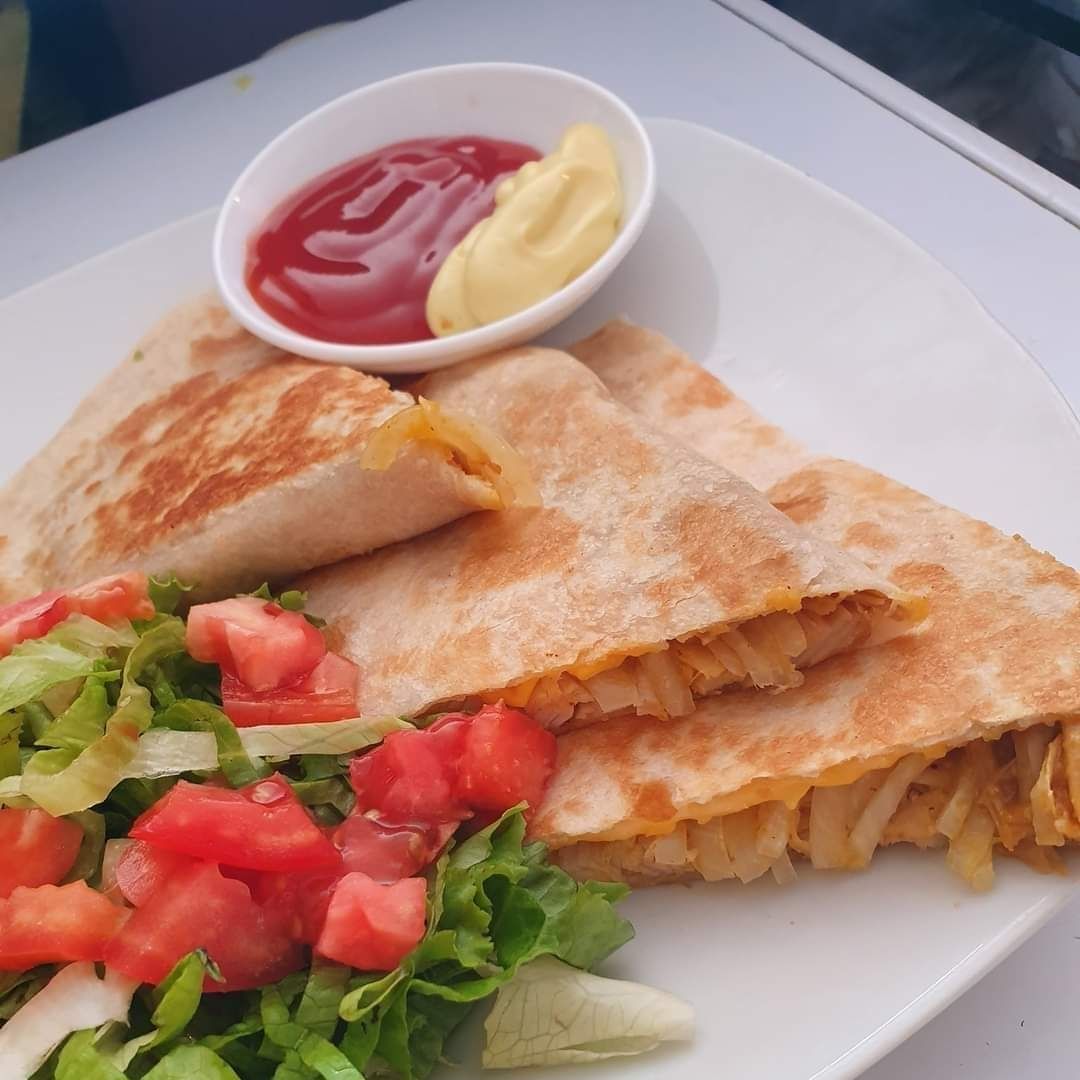 Quesadilla es una tortilla de harina, rellena de pollo o carne, cebolla salteada , queso cheddar acompañada con ensalada y tomate natural.