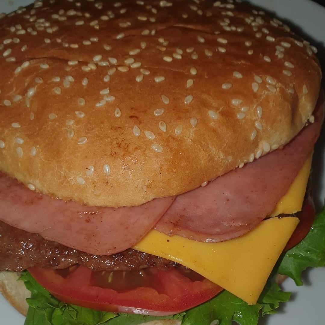 Hamburguesa con cebolla, lechuga, tomate, jamón y salsita de la casa.