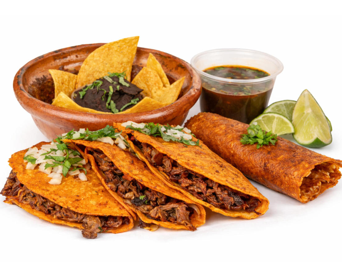 3 tacos de birria + acompanamiento a elegir (chicharron de queso, totopos con frijoles)