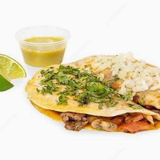 Doble tortilla de harina, queso, bistec, hongos y tocineta, ¡está cañón!