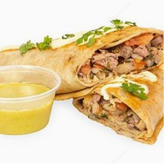 Tortilla de harina envuelta con carne de birria (res adobada) acompañado de frijoles, queso, pico de gallo y natilla.