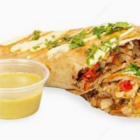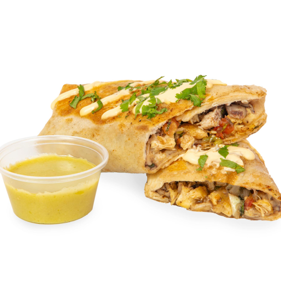 Tortilla de harina envuelta con pollo acompañado de frijoles, queso, pico de gallo y natilla.