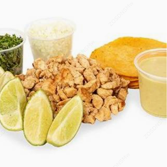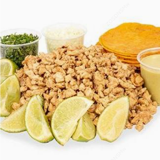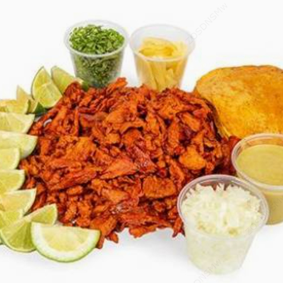 Kilo de pollo acompañado de 24 tortillas de maíz, culantro, cebolla, limones y piña.
