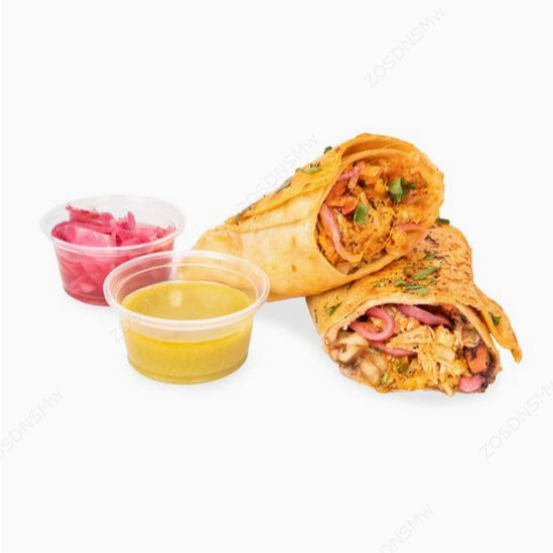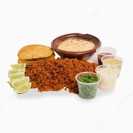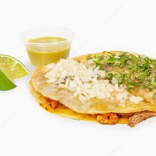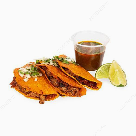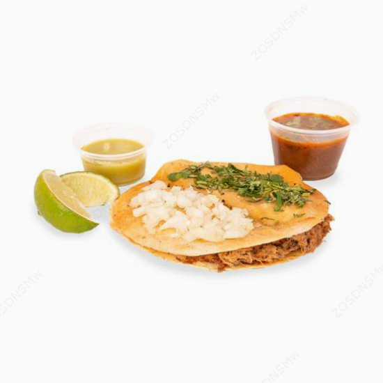Doble tortilla de harina con birria, cebolla, culantro, limón y consomé.