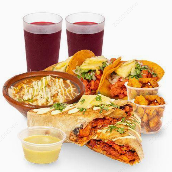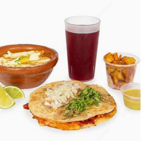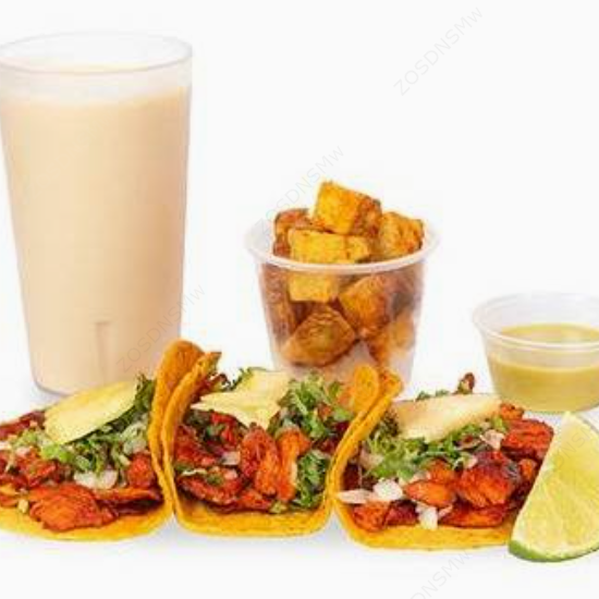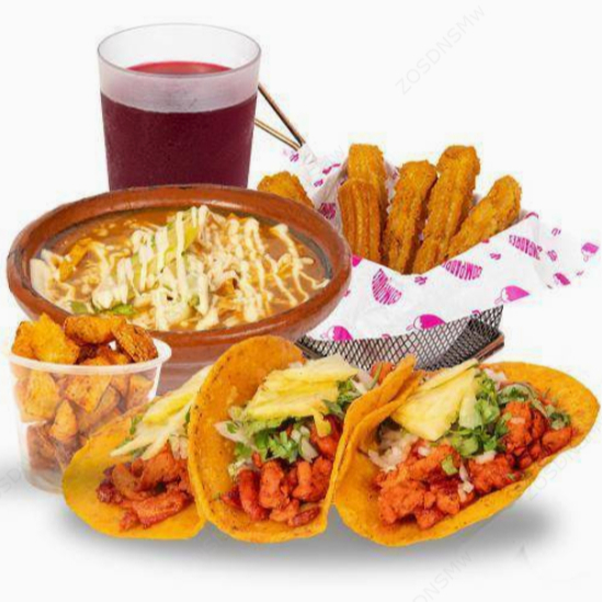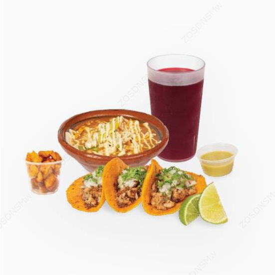 Son tres tacos del mismo sabor (tortilla de maíz) y una sopa azteca regular. Incluye fresco natural y un acompañamiento a elegir.