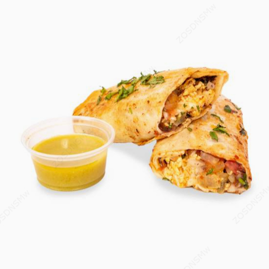 Tortilla de harina envuelta con frijoles, queso, pico de gallo, natilla, chile dulce y hongos.